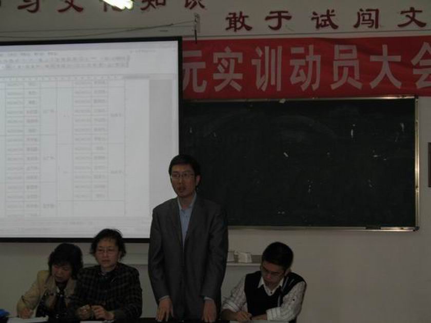 外经系文管教研室和实践教研室密切合作,历时一周时间充分准备,06文管班“百元实训”动员大会,于 会上,贺存乡主任做了动员性讲话,她从“百元实训”项目的综合性、实践性、开放性、职业性等特点出发,讲解了本次实训的作用、意义,往届学生在本项目实训中的经验与教训,具体操作中应注意的事项等,广泛而全面地与学生进行了沟通、交流与指导,并对指导教师和学生提出了几条要求和希望;还特别强调了本次百元实训要在05文管学生实训成果的基础上,严格按百元实训的操作流程和操作手册认真组织实施,不断巩固和提升百元实训教学项目的作用与成果。 最后王彤付处长给予了同学们几点提示,他说这是一次难得的锻炼机会,要珍惜;在经营中要积极思考文管专业的特色在哪里?要做到诚信经营等。 百元实训动员大会,使同学们对该实训项目有了全方位的认识,信心大增。06文管百元实训就此启动,拉开了实战的序幕。 文管专业教研室 王广平