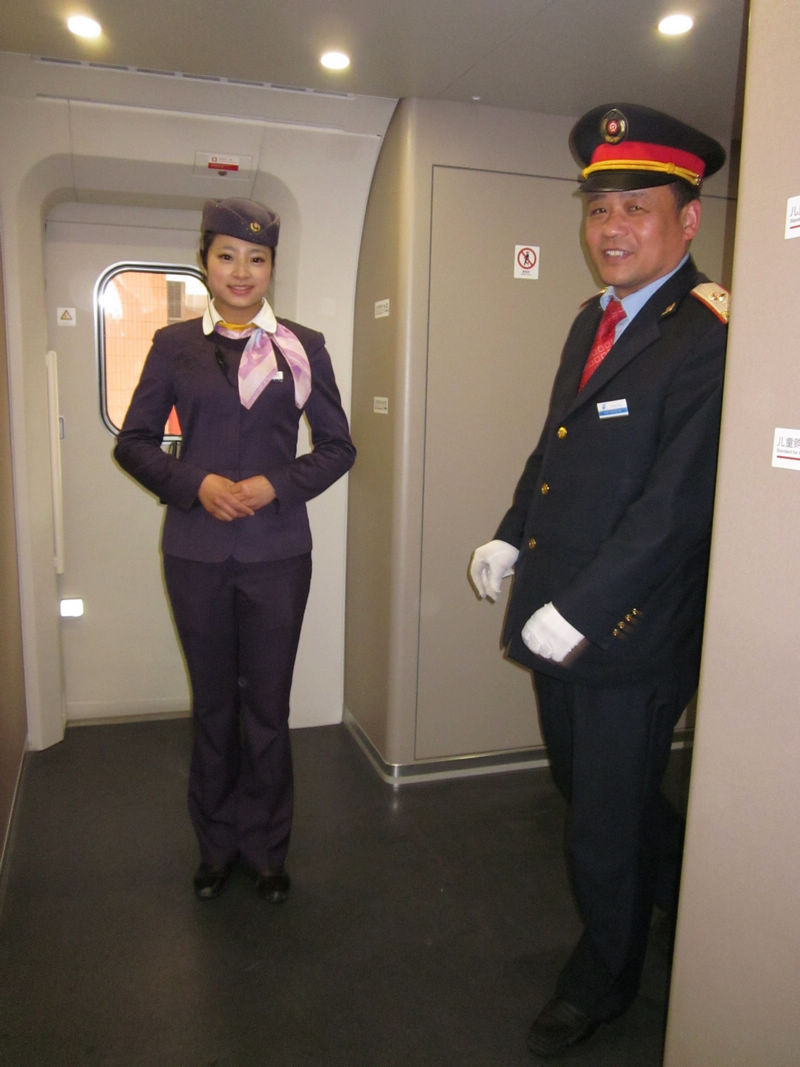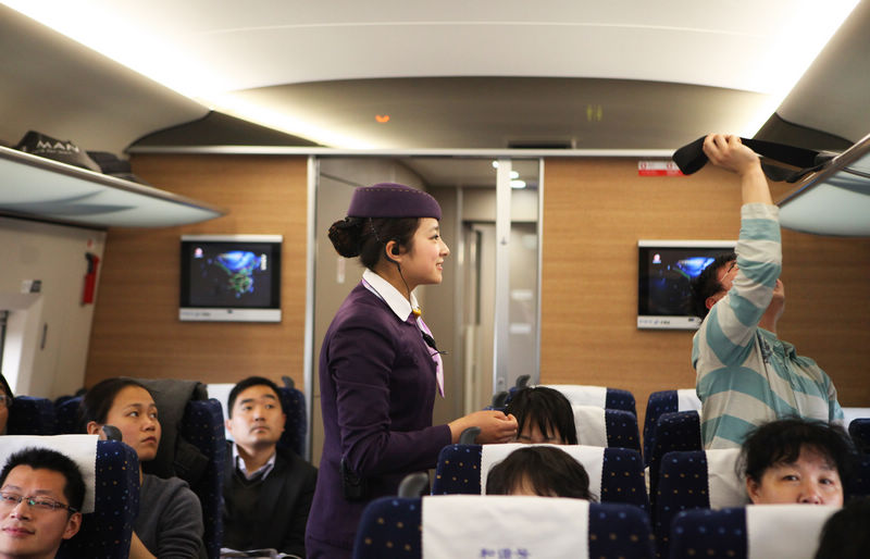 胡佳和高翔在列车长的带领下,分别负责4节车厢。按照要求,她们在发车前2小时到岗,开会交代注意事项,然后进站、上车,预先检查车上备品如安全锤、卫生纸等,站在车厢门口为乘客指引方向,然后巡视车厢,检查、调整行李箱,宣传安全知识,为乘客答疑释惑等。高铁动车上还设有包厢,为贵宾送水也是职责之一。这一切刚做完,列车已达到下一站,乘务员得马上去站岗,协助乘客上下车。有时候还要帮助没来得及买票的乘客补票。如果旅客遇到突发性问题,需要帮助,乘务员也必须在最短时间予以解决。总之,每个环节都不能出现拖拉马虎现象。