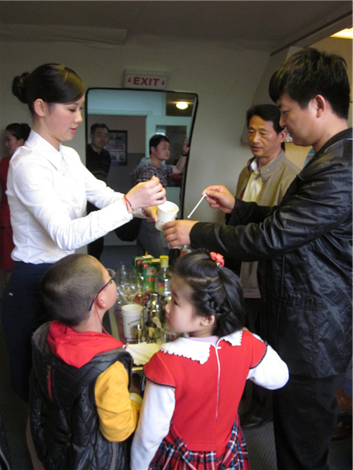 随后,礼仪小姐将贵宾带到了此次体验的重点——空乘模拟机舱,体验了享受空中服务的全过程。在“飞行”过程中,空姐们推出餐车,为乘客奉上茶点饮料,曾是香港国泰航空公司空姐的翁英老师带领学生为客人表演了商务舱调酒艺术。体验者中年轻夫妇带老人和孩子一起来体验的比较多。孩子们聚精会神地观赏着空姐的演示,并不时地要求亲自动手调酒。看到家长开心地品尝着自己亲手调制的“含羞草”饮品,孩子们满脸兴奋。一位带孙子来体验的老人表示,没想到育英学院有这么好的专业,希望以后有机会再带孩子来育英看看,到模拟机舱坐坐。