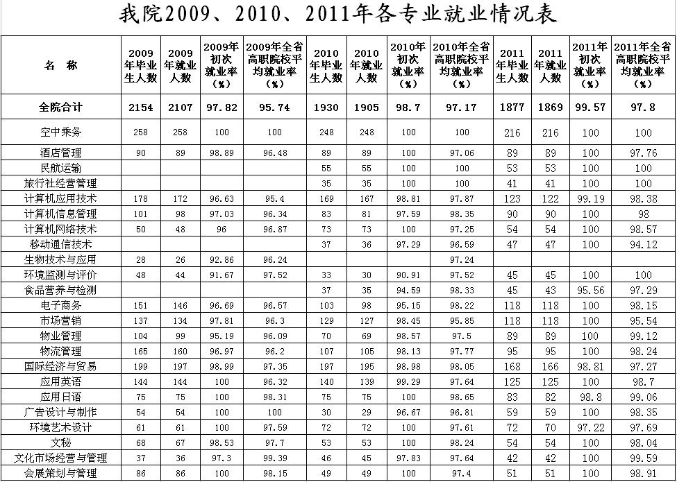 2009、2010、2011年各专业就业情况