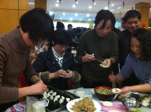 记妙趣横生的工会包饺子活动 经济贸易系所有参加活动的人员围在一起,拿出了各自的绝活,一个个形状各异的饺子就新鲜出炉了。赶快拿去蒸熟!不一会儿,食堂窗口的工作人员大声叫着“经贸!经贸!”有人飞奔而去,热腾腾的饺子来啦!大家凑在一起,热热闹闹吃饺子,欢欢乐乐迎元旦。 活动的高潮部分在于经常的赛事。 首先是由各教研室派出代表进行包饺子比赛。各位参赛选手运指如飞,一个,两个,三个……时间到!报数! 各位且慢,三位系领导出马了!结果,系主任谢厚华和教学副主任 比赛继续!男教师5人代表吃饺子比赛同样精彩,最快的选手在2分钟之内吃了13个饺子。好样的! 男教师比完了,轮到经济贸易系5个教研室主任的比赛了。国贸专业傅祝屏和实践教研室 虽然包饺子年年有,但是今年的活动特别精彩。大家不仅进一步练习了中华民族的传统手艺——包饺子,同时增强了教师间的友谊,为密切大家的联系搭建了很好的平台。 经济贸易系工会 2012年12月27日