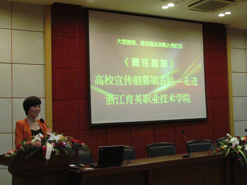 5月18日下午,“勇往直前秀自己,见习求职我帮你”大型创业、就业励志类真人秀栏目《勇往直前》高校宣讲招募第五站在我院学术报告厅拉开帷幕。此次活动是由共青团杭州市委、杭州文广集团和我院联合主办,由杭州大学生创业联盟、杭州电视台综合频道和学院团委承办。团市委青创部朱青青、杭州市电视台《勇往直前》栏目编导周丽娜、杭州美仑服装有限公司总经理刘鸿雁出席本次活动,学院学生处、团委及招就办相关负责人观看了此次宣讲会。