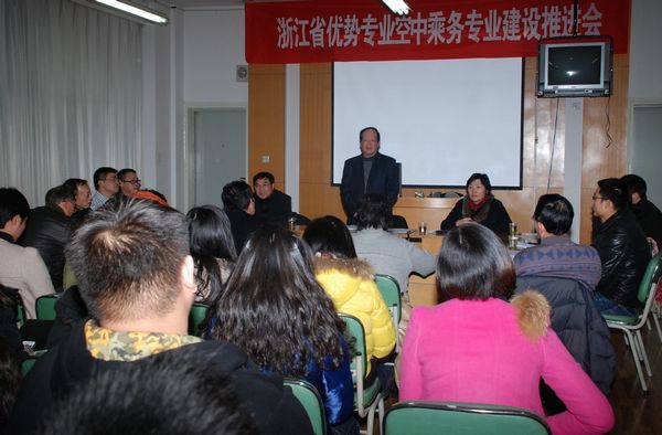 2012年12月26日,学院召开浙江省优势专业空中乘务专业建设推进会,研讨专业建设方案,部署下一阶段建设任务,以优势专业建设引导学院新一轮高职教育改革。