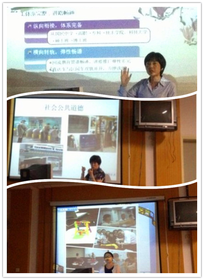 会上去台湾学习交流回来的三位教研室主任先后做了PPT展示,三位老师从不同的角度、不同的层面都做了非常精彩的发言,她们的经验分享让我们也感同深受的得到了一些学习和启发。