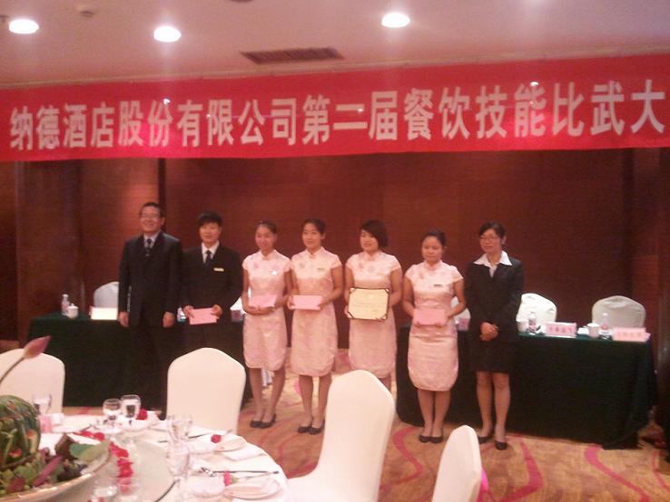 2013年9月2日下午2点在杭州纳德大酒店四楼宴会厅举办杭州纳德酒店股份有限公司第二届餐饮技能比武大赛。我院酒店教研室徐芳老师对纳德酒店的此次比赛进行了技术指导,对于餐饮技能比武的组织形式、比赛内容、技术标准、评分标准等都给出了专业的意见。徐芳老师还担任了此次比赛的特约评委、颁奖嘉宾。而我们纳德班的学员姜瑜欢和许楚楚两位同学因为在纳德自由酒店表现突出,而被推选为自由店的参赛团队成员参加了此次比赛。两位同学在比赛过程中,分别担任宴会主题解说和斟酒的任务,表现均非常突出。尤其是姜瑜欢同学在解说宴会主题时能够做到完全脱稿,在对台面设计、菜单设计、中心装饰物设计的介绍能够结合自己的理解,深入地、有重点地给评委做了介绍,整个介绍表达清楚,仪态优雅,手势到位,得到了集团副总宋长鹰先生的点名表扬。最后,由我们学生参加的纳德自由店组获得了团体第二的成绩,对于刚刚在酒店实习1个多月的学生来说这是非常不容易的。此次比赛,让老师和同学都学到了很多。作为老师,这是一次与行业深入交流的机会,作为学生,这是一次检验学习和实习成果的机会。