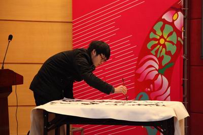 获奖选手还表演了琴棋书画,庞施乐同学演奏了悠扬的古筝,阮伟同学在现场铺纸磨墨,写下了“厚德载物、自强不息”八个遒劲有力的大字,引得师生一致好评。