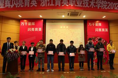 1月10日,学院2 012年终优秀学生颁奖盛典在三楼学术报告厅举行,党委书记、院长洪致平,副院长周治斌,副院长陈六明出席,学生处处长王敏,各分院(系)负责人及党总支书记,教研室主任,指导教师,学工秘书及班主任,下半年在全国、省市各项竞赛中获奖的学生,各班学生代表参加表彰大会。团委书记邬佳主持典礼。