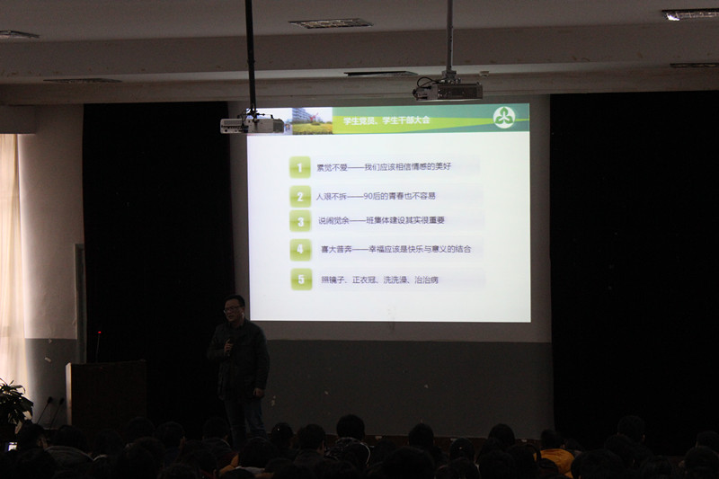 本次会议一改往日传统的工作布置形式,由一场耐人寻味、吸人眼球的微电影拉开序幕!继而,学生处王处长做了“2014,我们应该如何前行”为主题的讲话,用了2013年网络流行语“累觉不爱;人艰不拆;说闹觉余;喜大普奔”阐释了大学生活的本质意义;还用了“照镜子,正衣冠,洗洗澡,治治病”等词作了相关学生工作内容的阐述。他不再进行说教,用新颖的网络用语、具体生动的案例贴近了学生干部的心灵世界,引起了大家强烈的共鸣。最后他表明:只有触动心灵情感的教育,才是让孩子们能够记住的情感。