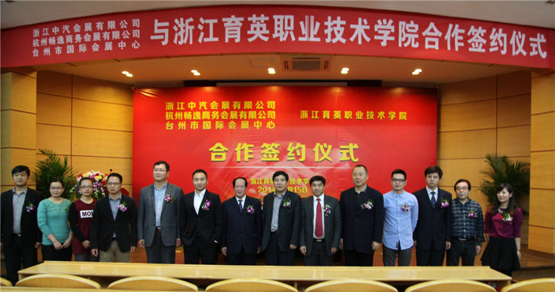 方曦、赵建和王锡耀分别代表浙江中汽会展有限公司、台州市国际会展中心和学院签订合作协议,与会嘉宾上台见证签约仪式。