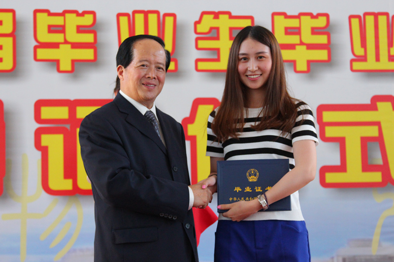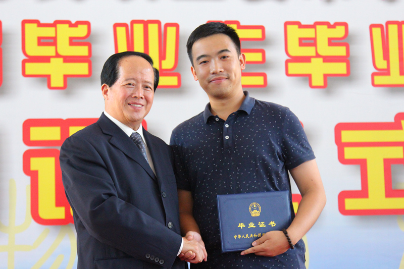 在体育馆,洪致平院长为毕业生逐个颁发毕业证书,并亲密握手合影。同学们有序排队,一一走上颁证台与洪院长合影。