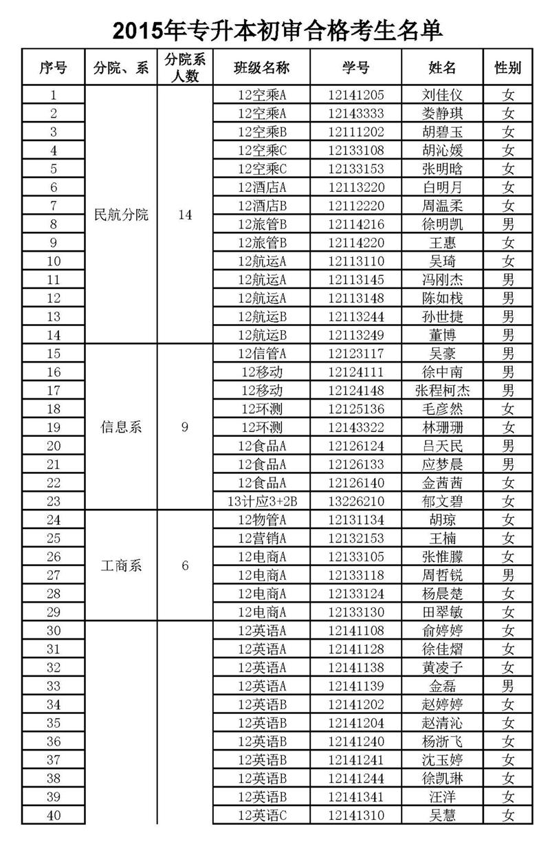 2015年专升本报名初审工作已经结束,现将初审合格考生名单进行公示(名单详见附件),公示时间10个工作日,若有异议,请联系教务处方老师,联系电话:86877015(内线7015)。