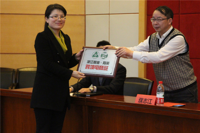 3月24日晚,浙江粮油·育英跨境电商班在三号报告厅举行授牌仪式。浙江省粮油食品进出口股份有限公司副总经理濮志江,学院党委书记、副院长王锡耀,产学合作处处长崔海辉,工商系主任欧阳驹出席。电商教研室教师、跨境电商班学生和2014级电商专业学生参加。