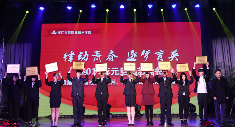 12月27日晚,“律动青春 逐梦育英”2017元旦文艺晚会暨第十二届社团文化月、第三届公寓文化节闭幕式在学院体育馆举行。学院院长盛健,党委书记、副院长王锡耀,党委副书记、副院长谢鑫,副院长王敏,分院、行政处室负责人及学生代表1000余人观看了表演。 盛健致新年贺词,他表示,第一次在这个校园里与大家共迎新年,感到既温暖又欣喜。温暖的是,下午与老师们在贤园餐厅一起包饺子、吃饺子,吃的是饺子,暖的是内心;晚上,又与全院师生代表欢聚一堂,沉浸在喜庆、祥和、团圆的跨年氛围中。2016,我们的学生在过去一年追寻梦想,不畏高手,努力拼搏,让“育英”的名字一次次载入各类比赛的史册。2017,希望每一位学生用自己的努力,更好地成长;2017,希望每一位老师用自己的努力,更好地发展;2017,我们的学院会成为一个更好的幸福家园! 第一篇章“韵启艺舟 扬帆起航”的5个节目由大学生艺术团选送,曾在浙江省大学生艺术节获戏剧类一等奖、舞蹈类二等奖,学生们再次演绎了戏剧《生命不止于···》和舞蹈《傩月》,节目可谓看头十足。器乐《克罗地亚狂想曲》、小组唱《追梦》和戏曲《三请樊梨花》精彩不断,吸引着台下观众的目光。 各分院带来晚会的第二篇章“缘启育英 筑梦青春”,各具特色,极具青春激情,节目异彩纷呈,现场掌声不断。 信息技术分院的舞蹈《青春士兵》 、民航交通分院的职业展示《梦想家》、商务贸易分院的舞蹈《激情一夏》、创意设计分院的情景剧《绘梦》、经济管理分院的舞蹈《Laos奇缘》以及继续教育分院、中汽模特、礼仪协会的走秀《相与》高潮迭起,给人留下深刻印象。 第三篇章“征途不止 薪火相传”,2016全国高校巡回演出歌舞《树屋女孩》、街舞社《Hope of rebirth》、大学生艺术团的戏剧《前面有棵树》和舞蹈《摆手女儿家》,或青春欢快,或将我们带入对人生的思考。晚会在合唱《灿烂未来》中落下帷幕,掌声不断。 晚会还为公寓文化节优秀寝室和社团文化月精品活动颁发荣誉奖牌。3116、3107、5304、6526等寝室被评为公寓文化节优秀寝室;樱花日语协会、英语协会、棋社、书友协会等协会的活动被评为社团文化月精品活动。 晚会其间穿插了抽奖环节,气氛活跃,彰显喜庆祥和的节日气氛。