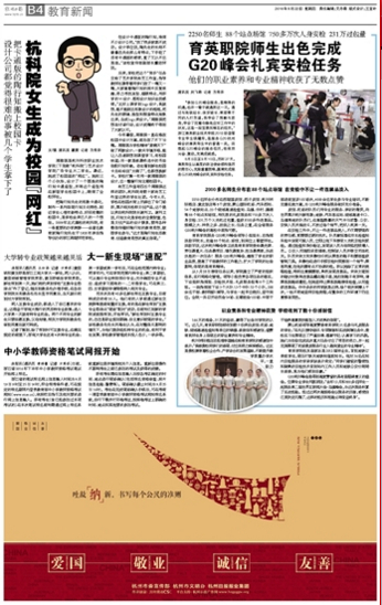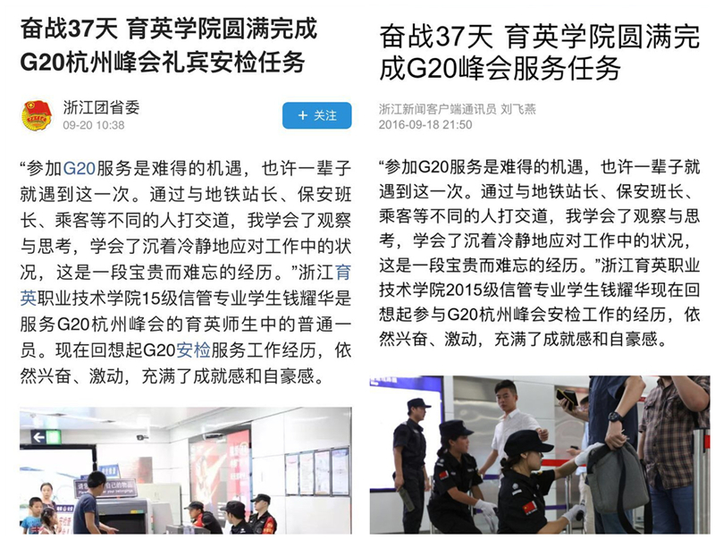 9月10日,我院最后一批服务G20的师生凯旋,育英人不辱使命,圆满完成了所有服务G20杭州峰会的礼宾和安检任务。杭州日报、浙江教育报、浙江新闻客户端、杭州网、浙江团省委头条号、杭州团市委头条号、杭州共青团微博等媒体报道了我院这次光荣而重大的任务。