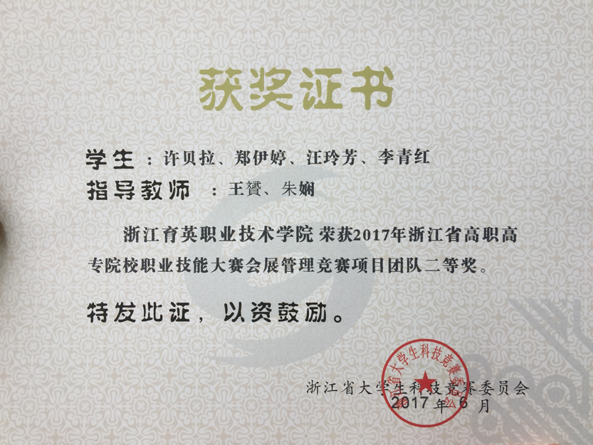 创意设计分院会展策划与管理专业师生在本次浙江省高职高专院校职业技能大赛会展管理竞赛项目中,共获团体二等奖2个,团体三等奖1个。本次大赛隶属于于浙江省大学生科技竞赛,由浙江省教育厅颁发获奖证书。本赛项包括展览策划、会议策划、节事活动策划三个方向,各参赛队围绕会展项目的题材分类,自行选题,组织策划。要求论据充分,理论实,突出方案的创意性和可操作性。