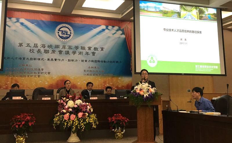 2017年11月14日,第五届海峡两岸高等职业教育校长联席会议学术年会在台湾圣约翰科技大学举办,我院受邀出席此次年会。副院长谢鑫代表学院参加此次论坛,并受邀在年会中就高职院校专业人才品质培养相关主题与两岸嘉宾做现场分享。