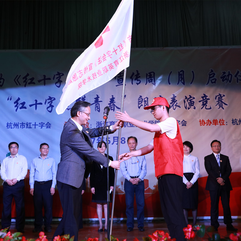 仪式上,全体红十字会工作人员和志愿者进行“我是红十字人”主题宣誓,市红十字会宣布成立《红十字会法》宣传志愿服务队;杨建华为杭州市《红十字会法》宣传志愿服务队授队旗;市《红十字会法》宣传志愿服务队队长、我院学生陈俊伟发言,倡议全省广大红十字志愿者和爱心人士,从我做起,争当《红十字会法》宣传员、践行者和示范者。