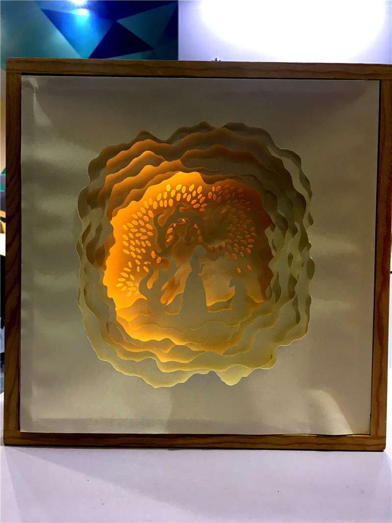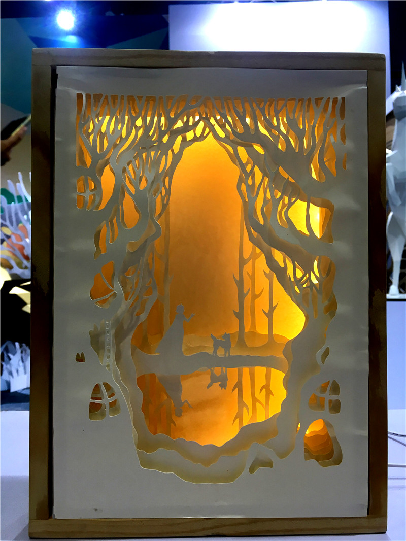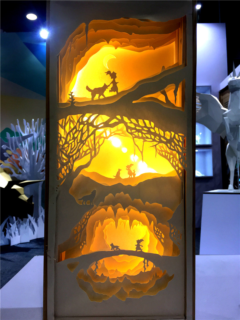 由创意设计分院谢斌斌老师指导,14级两岸合作文化创意“龙华班”杨立同学创作的纸雕综合艺术作品——《流浪狗的故事》在“叹为观纸”主题展区展出。作品以一个女孩与一只流浪狗的相伴成长为主题,融合纸的参差、灯的艺术,塑造出栩栩如生的动人画面。其精彩创意及细腻的工艺吸引了众多观众驻足欣赏,浙江卫视特别安排对该作品做了报道。随后该组作品便迅速在参观者的“朋友圈”传开,成了文博会上“网红”作品。