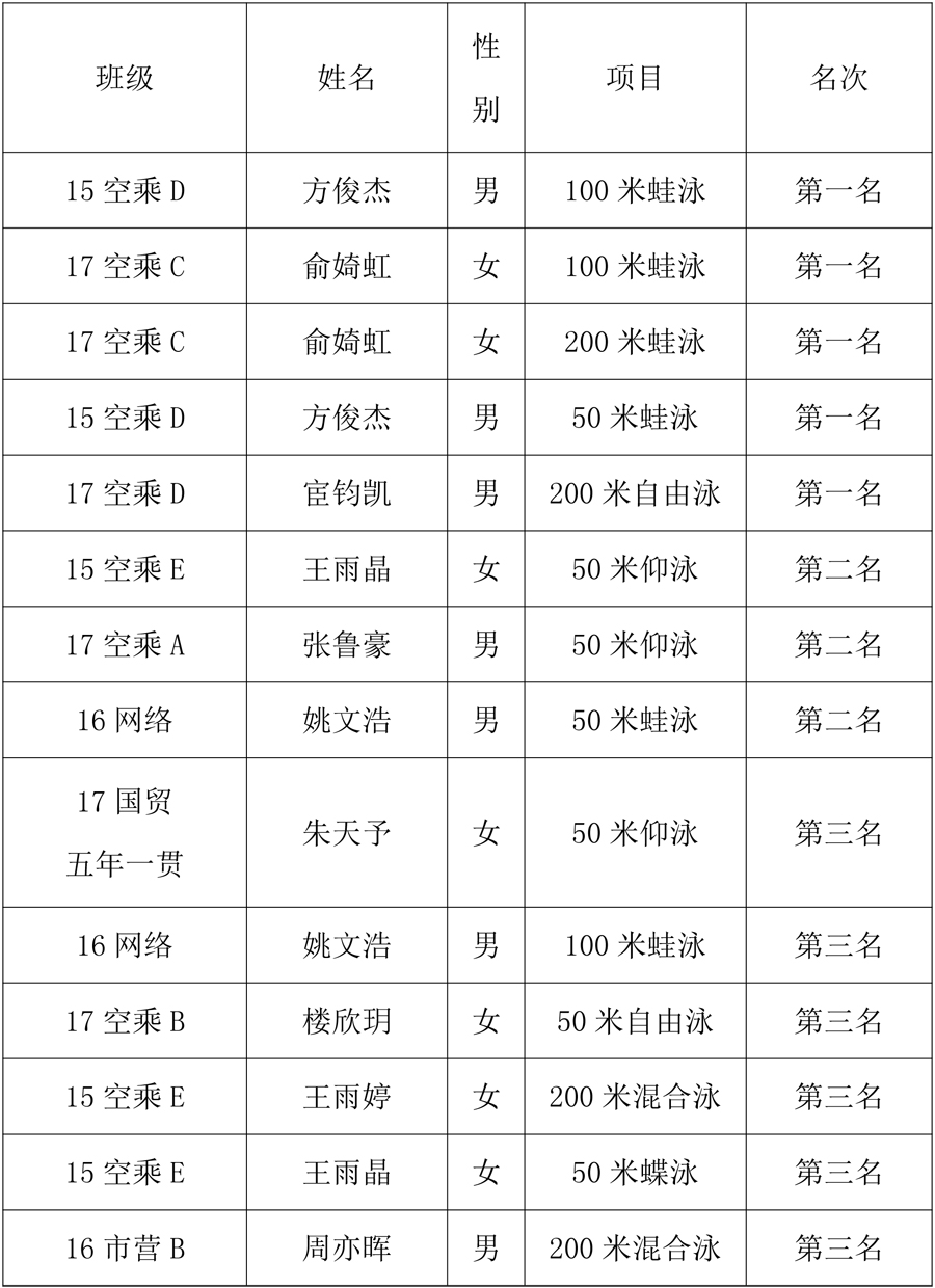 2018年5月31日-6月3日,2018年浙江省大学生游泳锦标赛在浙江财经大学举行,我院游泳队一举斩获7金3银6铜,总团冠军、男团冠军、女团季军,学院获体育道德风尚奖,楼俊毅获“优秀教练员”称号,王雨晶、王雨婷获“优秀运动员”称号。领队徐晓斌、主教练赵佳子、教练员楼俊毅。