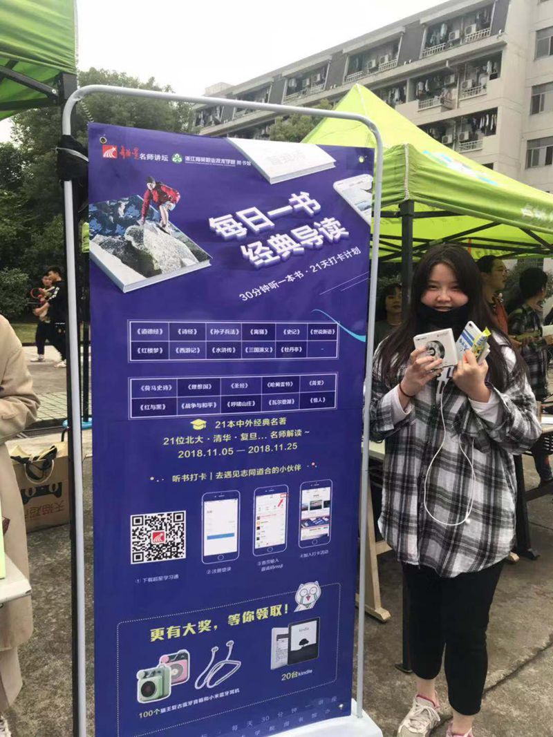 11月6日,“每日一书,经典导读”活动打卡阅读推广现场活动在生活区学生餐厅门口开展。活动内容是连续21天打卡,每天花30分钟在网上听一本书,这21本经典图书由北大、清华等名校21位名师导读。