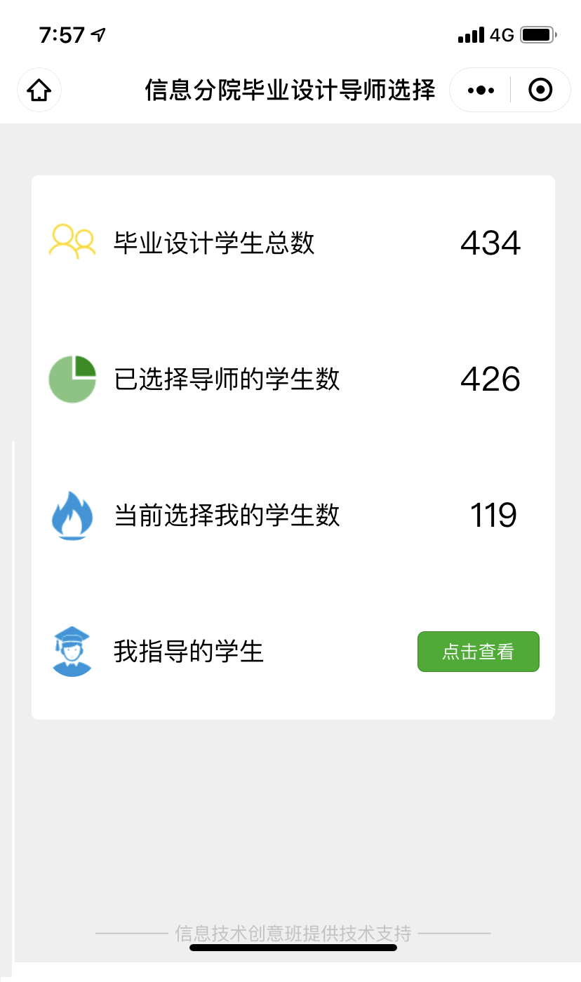 信息技术分院在总结前几届学生毕业实习、毕业设计工作的基础上,结合学院的关于毕业生毕业实习和毕业设计的具体要求,今年采取了一个新的模式,即由学生进行毕业设计导师的选择。为此,分院专门开发了一个“信息分院毕业设计导师选择”的小程序,学生在手机客户端进入小程序就可以进行导师的选择,每个学生可以按顺序选择5位指导老师,最后根据学生选择结果再进行系统的分配。目前学生选择导师和系统分配都已经完成,进入到导师和学生对接并进行具体毕业设计综合实践指导的阶段。