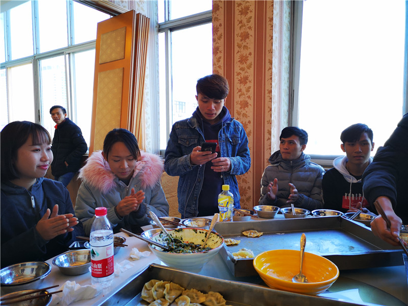 29日中午,学院院长盛健、副院长谢鑫、经管分院、外事办相关领导以及留学生班任课教师在贤园餐厅和45位留学生一起包饺子、吃饺子、共唱新年歌。谢鑫副院长向留学生讲解饺子馅和饺子皮的制作方法并教孩子们如何包饺子。汉语老师王彤介绍了饺子的历史起源和民俗传统,老师们和同学们共唱中文歌。