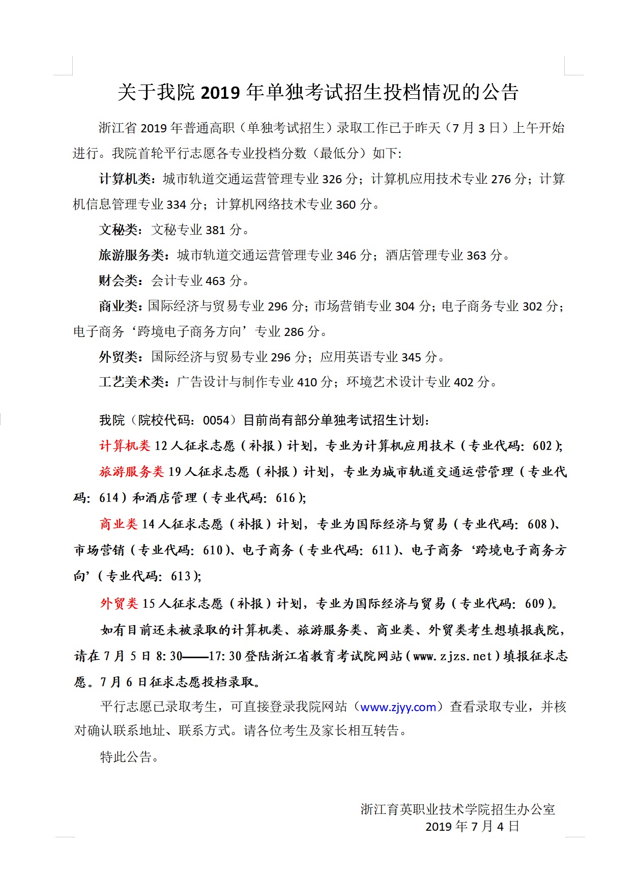 关于我院2019年单独考试投档情况的公告