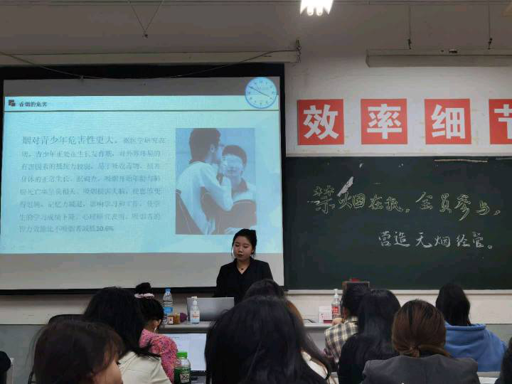 班会最后提出倡议:请大家爱自己,丢掉所有的香烟,控制自己;不要去吸烟场所吸二手烟,保护自己;餐后喝水、吃水果或散步,摆脱饭后一支烟的想法,健康自己。青春花季, 拒绝吸烟!