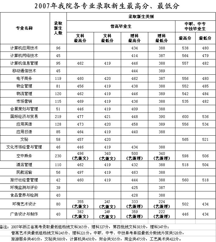 我院2007年省内各专业录取新生最高分、最低分