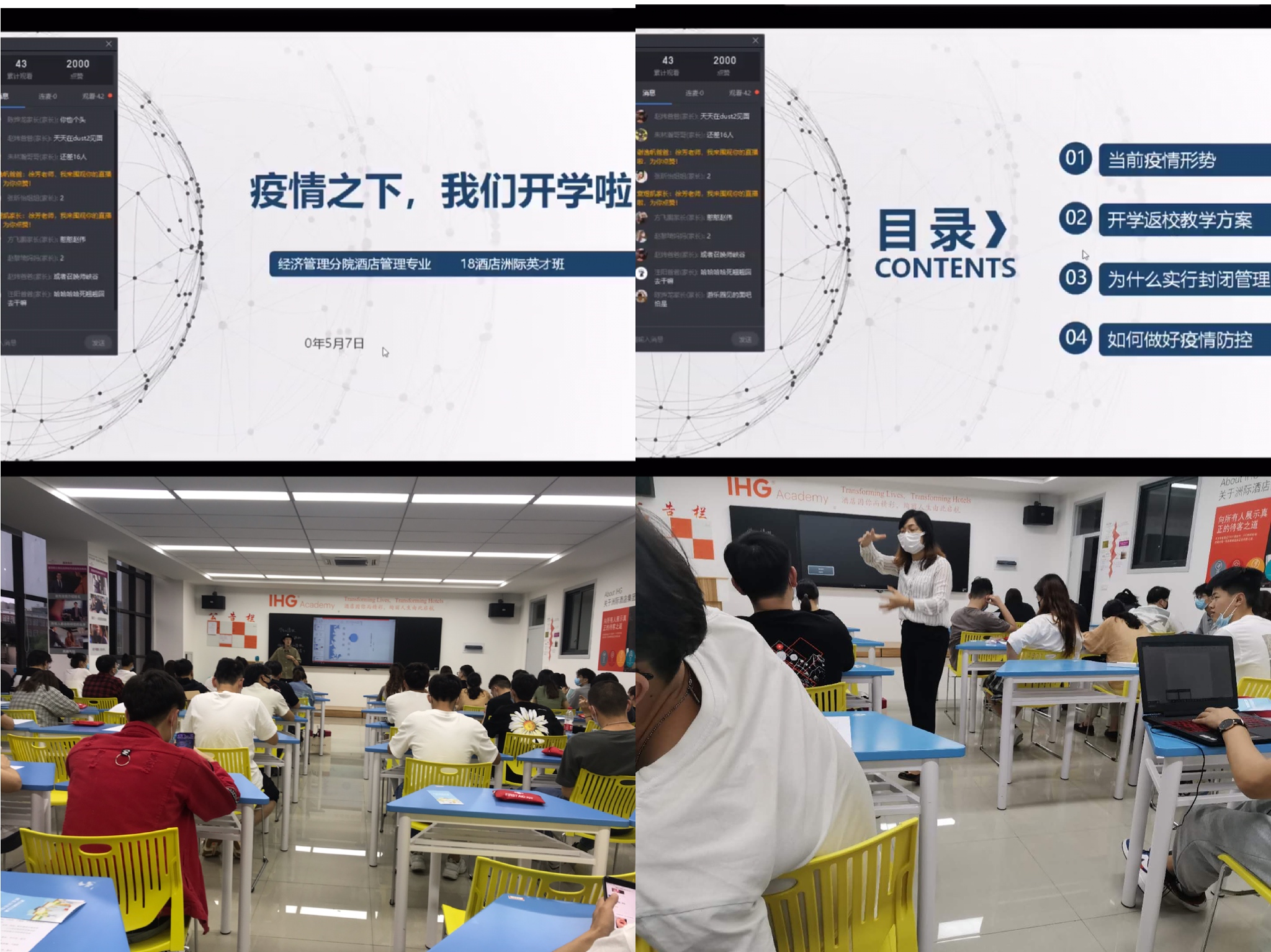 2020年这场突如其来的新冠病毒席卷了全球,给社会的方方面面都带来了深远的影响,我们的学生也经历了有史以来最长的寒假。随着我国疫情逐渐得到控制,各地高校陆续复学。为了保证学生能顺利复学、安全复学,作为学业导师,徐芳老师在学生返校前和返校当天分别开展了疫情之下复学动员及疫情防控主题班会。5月7日19:00时,徐芳老师给18酒店洲际英才班通过钉钉直播召开了疫情之下学生安全返校复学的动员会。会上,为同学们分析了当前国内外疫情形势,并详细介绍了在当前疫情形势下学校的开学返校教学方案,让学生知悉开学后面临的教学活动的新变化以及学校对教学管理的规范和要求。同时,跟同学们一起分析了学校为什么要实行封闭式管理,以及大家如何在返校后做好疫情防控。针对同学们提出有关外出、请假、用餐、返校时间等各种疑问,认真地做好解答。5月11日,18级学生返校。在返校当天,我与辅导员老师一起召开了“疫情在前,责任在肩”的开学主题班会,辅导员裴老师主讲,徐芳老师协助答疑。会上重点讲述了疫情期间学院封闭式管理的各项措施,并动之以情、晓之以理地向学生解释封闭式管理的原因和意义,学生提出的一些疑问和困难有针对性地进行解答和解决。徐芳老师和辅导员紧密合作,尽力帮助班级同学能安全、安心的度过从线上到线下、从自由到约束的开学过渡期。