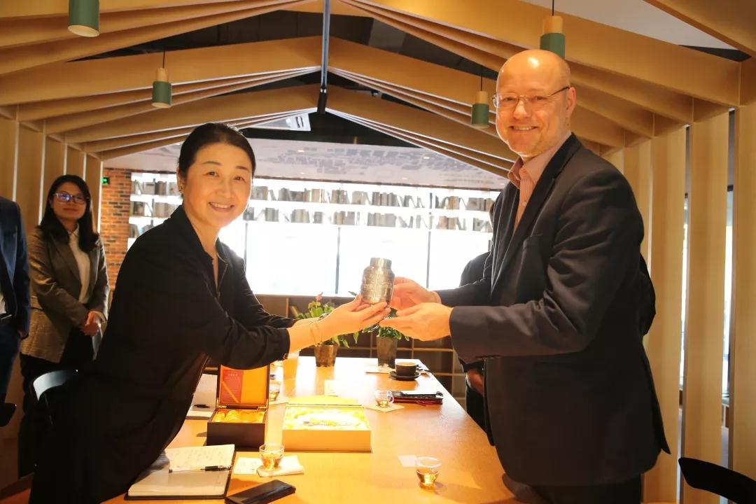 2019年11月英国密德萨斯大学代表来我院交流访问。党委副书记副院长谢鑫向校方赠送纪念品。