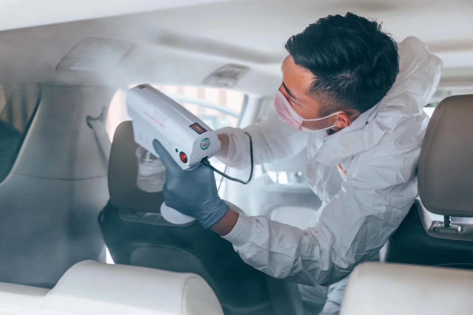 温作奖安排专业技师为教职工的汽车内部做除菌处理