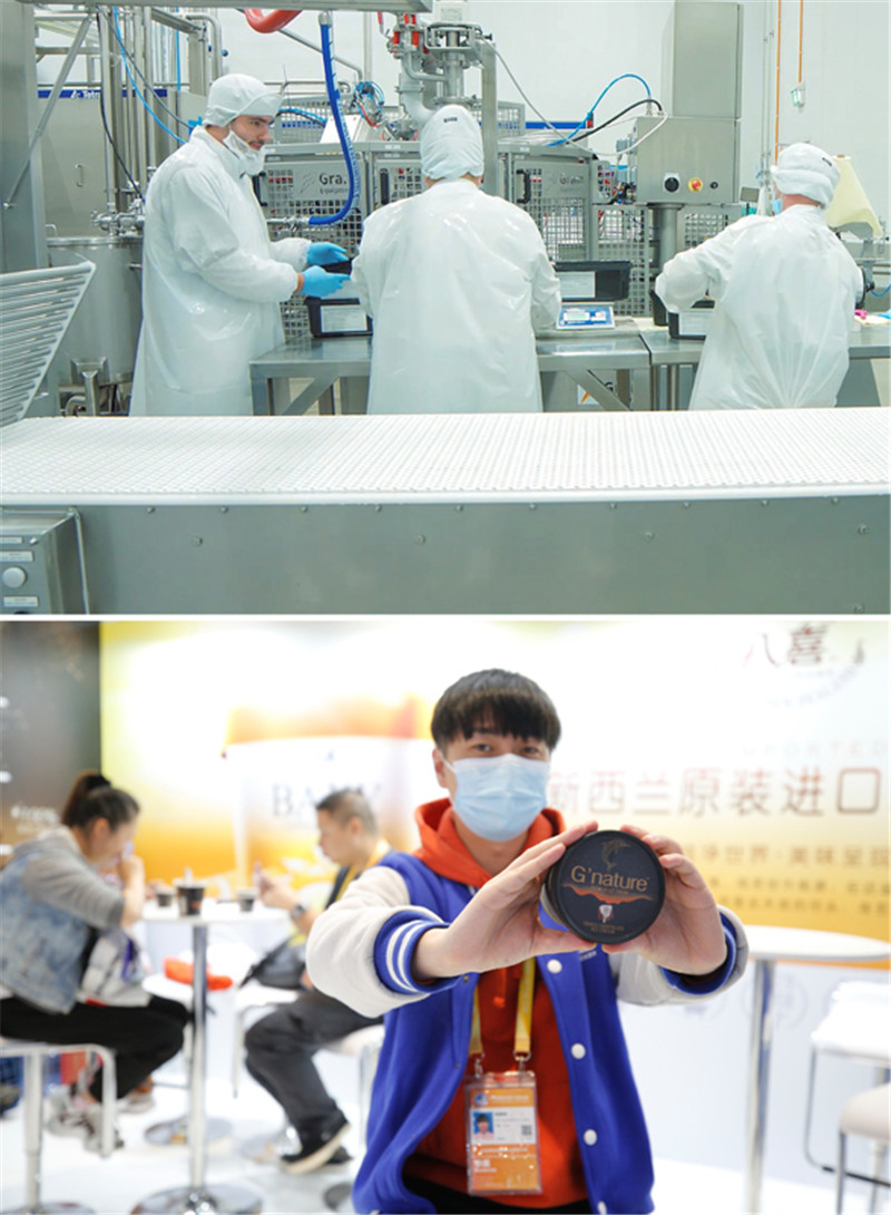 这是一张拼版照片,上图为艾莱发喜新西兰公司员工在冰激凌生产线上工作(资料照片,新华社发);下图为11月7日,工作人员在第三届进博会G'nature展台展示从新西兰进口的冰激凌(新华社记者 张玉薇 摄)。新华社发