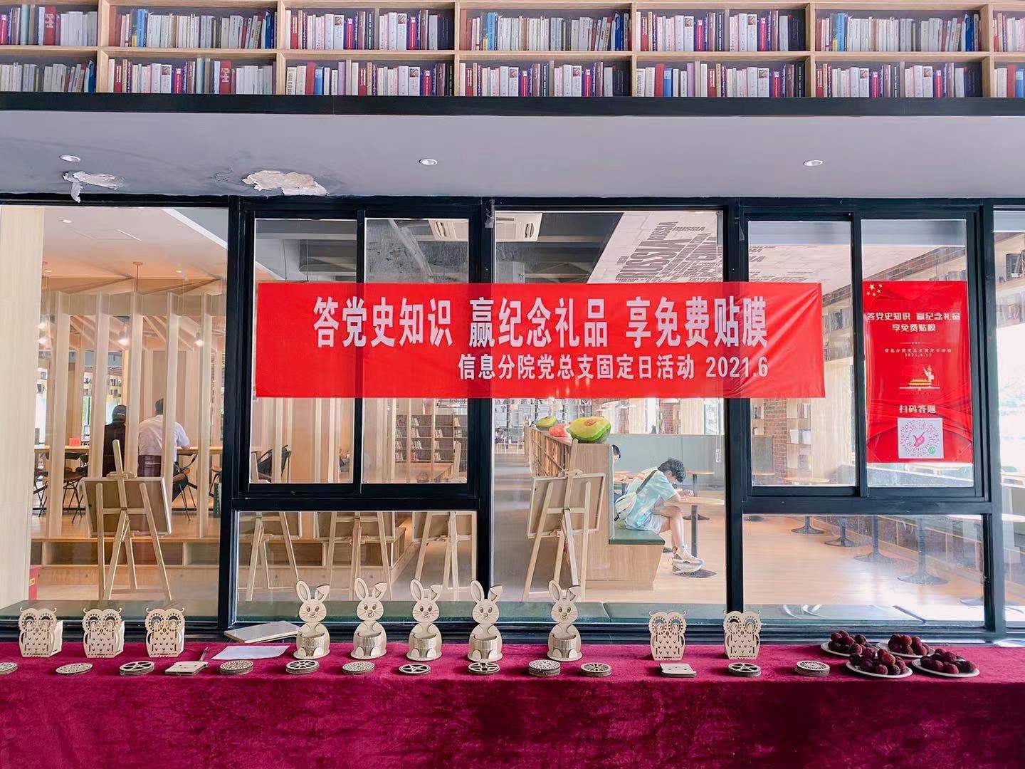 今年是建党百年,为了迎接党的百年华诞,6月15日中午,信息技术分院党总支在学院教学区1号楼一楼东边厅举办党史知识竞答活动。该活动面向全校师生参与,参与者可用手机上扫二维码,打开链接进入党史知识竞答界面,在规定时间内完成答题,根据得分排名情况赢取各类精美纪念品。本次活动纪念品包括收纳盒、笔筒、杯垫、书签等,不仅制作精美,而且均为私人订制,是由信息技术分院何燕飞老师独立设计,由冯斌、季豪豪等同学完成激光切割、组装成型等工作。除此之外,源于对母校的深厚感情,分院毕业生胡鹏同学创业的海牛工作室还特地在现场为全院师生提供免费的手机贴膜服务。