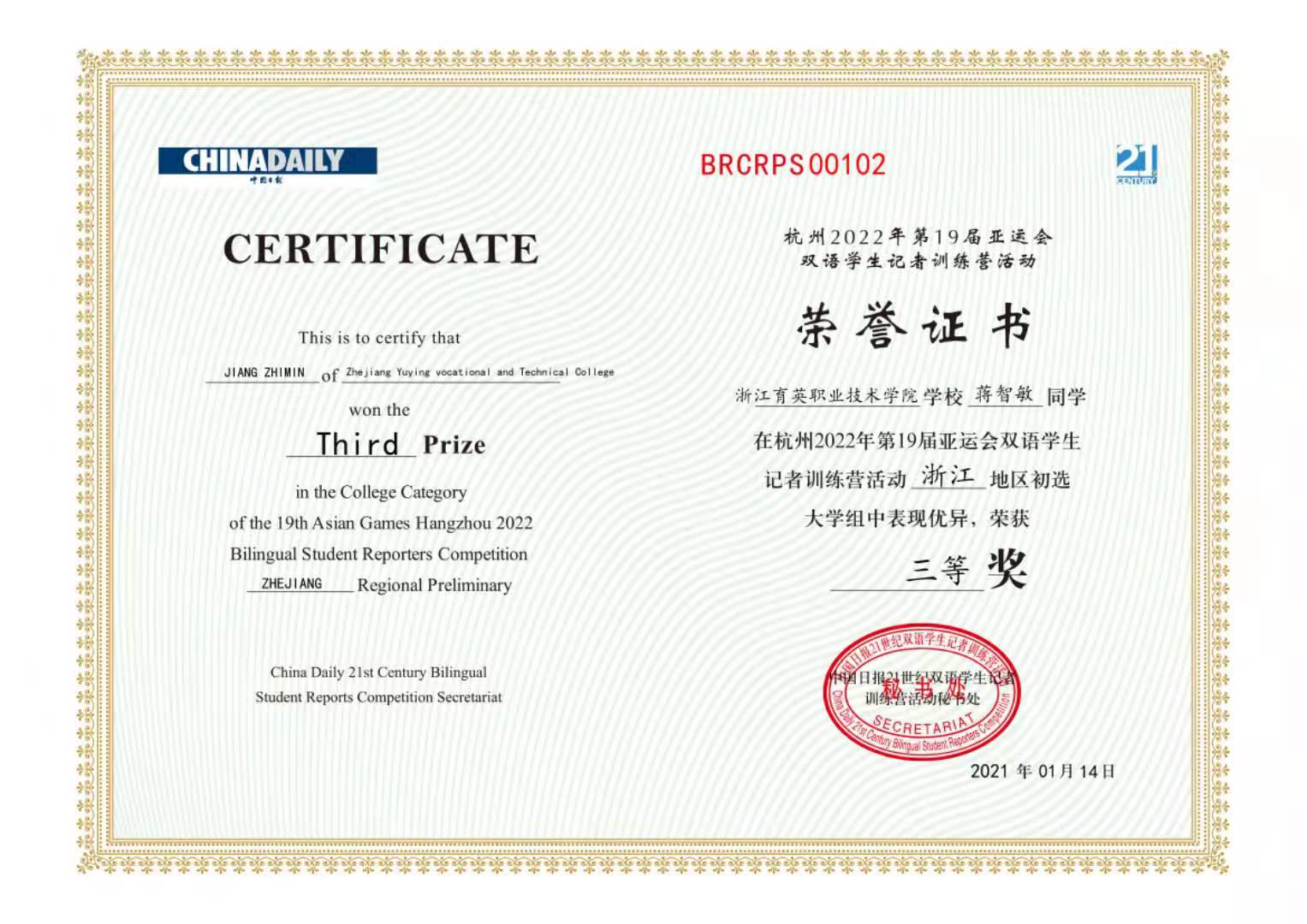 选拔分为三个阶段——城市选区初选、城市选区复选、全国决选和训练营阶段。选手在活动中需完成已备演讲、模拟采访、撰写通讯稿等选拔内容。2021年1月经管分院19英语蒋智敏、王昕怡,19文秘许梦云获得三等奖。指导教师:沈晚笑、黄静、葛秀华。这是经管分院的学生首次以英语的方式讲杭州故事,助力杭州亚运会宣传工作。