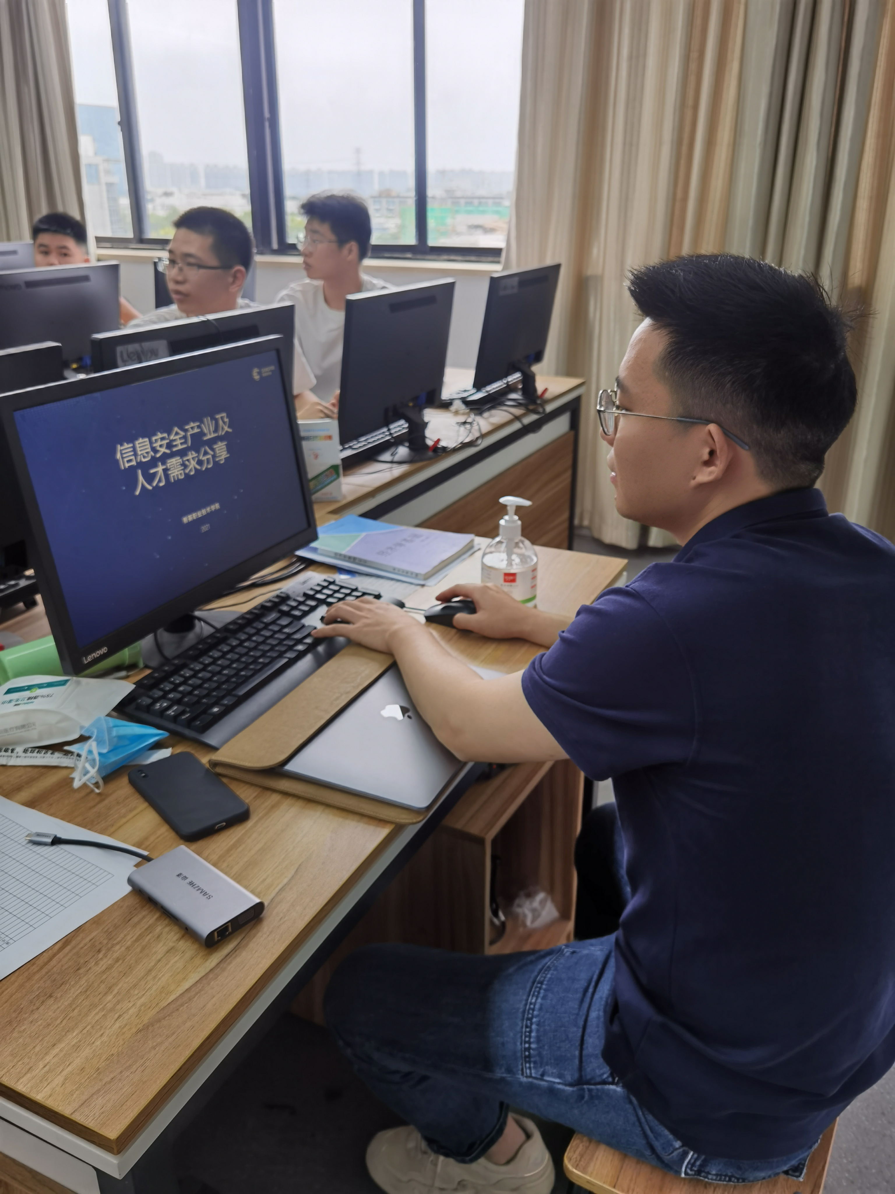 接着,由金锐向同学们简单介绍了深信服公司的一些情况,以及实训过程中的一些要求。训练营的讲师们都是从全国各地调过来的最优秀的讲师,期待同学们能认真完成训练营的学习,考取信息安全方向的1+X证书,并且从事这方面的工作。