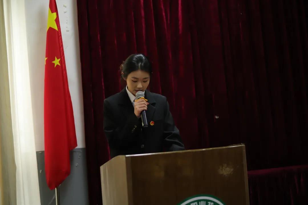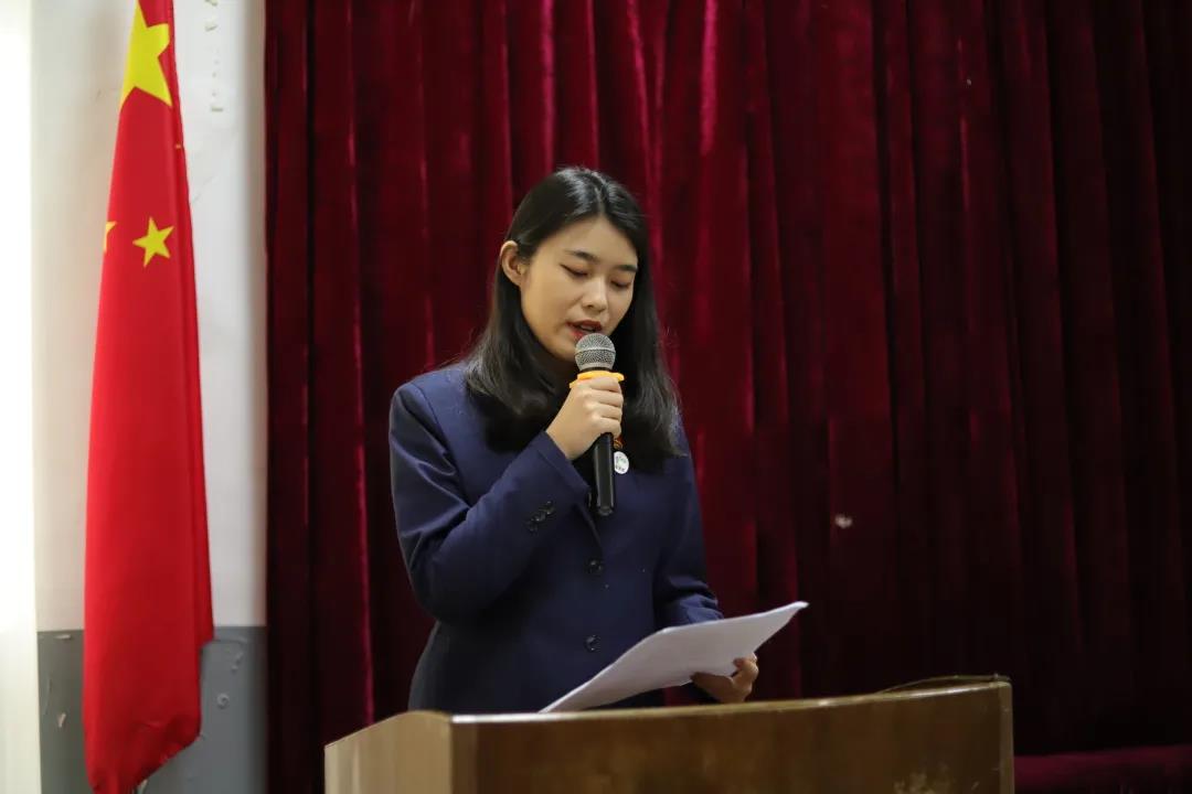 院学生会执行主席、杭州市优秀团员、学生干部代表徐晨阳同学讲到“走进校门的是大学生,培养出来的是职业人”,从大学生到职业人,承载着“厚德载物、自强不息”厚重的底蕴。而作为学生干部的我们,要坚守初心,弘扬育英精神。她鼓励同学们在校期间积极参加学校的各项活动。她说“请记得故事开始的那个地方,心中有信仰,脚下才会有力量”。敢于尝试,在坚守中收获成功,坚信每一个育英人会越努力越幸福,在平凡中的坚守,在坚守中收获成长。相信在做的各位,一定会响应徐晨阳同学的号召,凝心聚力,牢记使命,做中国共产党的后备军,做新时代发展的主力军。