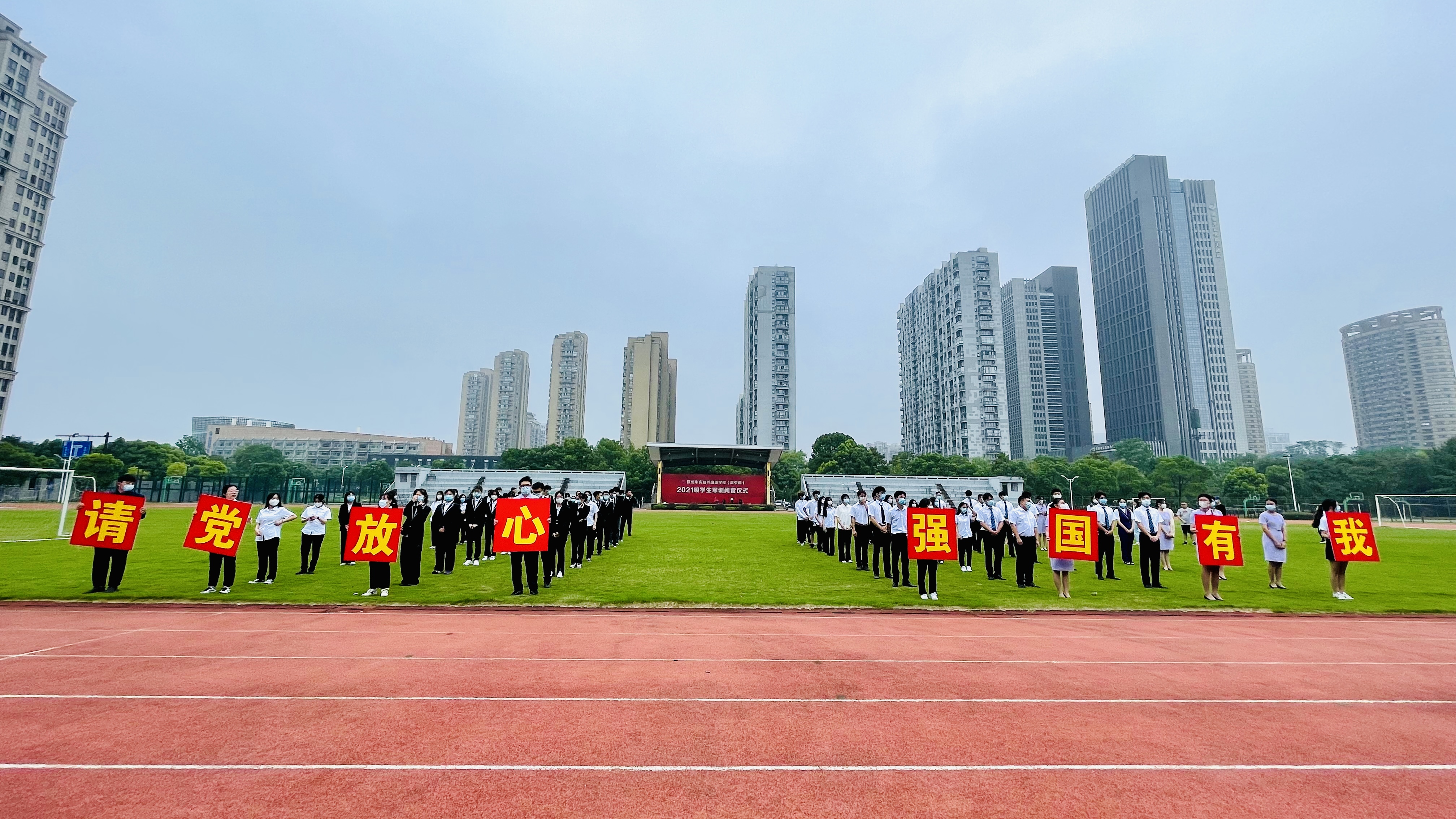 升旗仪式结束后,广播台喻佳政、李来、胡燕燕、柯雨欣四位同学带领大家重温建党百年献词——《请党放心 强国有我》。在悠扬又跌宕起伏的伴奏中,在铿锵有力的朗诵里,全体同学发出“请党放心,强国有我”的青春誓言。