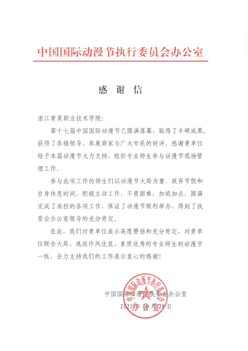 王敏表示,杭州着力打造具有世界水准的国际会议举办城市、会展之都、赛事之城,育英学院与浙江省会展行业协会、杭州市会议展览业协会紧密合作,师生积极参与省、市会展产业及文化创意产业的各项活动,为杭州的经济和产业发展贡献力量。自2009年以来,与中国国际动漫节节展办公室合作,并于2015年开始进入深入合作阶段。学院是每年一次的中国国际动漫节最主要的志愿服务高职院校,动漫节实训成为会展专业重点实训项目,同学们在顶岗实训中积极参与各类会展活动策划、运营等工作,不断提升职业素养和技能。