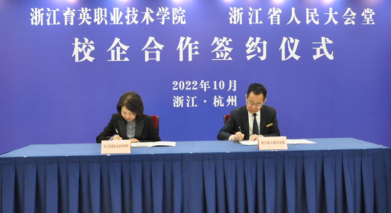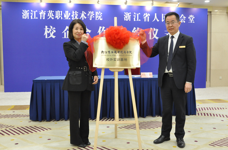 黄爱平与叶根棋代表双方签订合作协议,为“浙江育英职业学院校外实训基地”揭牌。