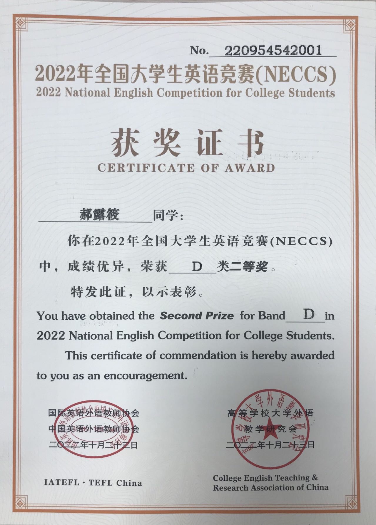2022年全国大学生英语竞赛(NECCS)全国决赛于2022年10月23日落下帷幕,全国24个省级赛区顺利进行。智慧旅游学院21级酒店专业学生郝露筱、连航宇、吴佳麒三位同学参加2022年全国大学生英语竞赛(NECCS)获得二等奖、三等奖。