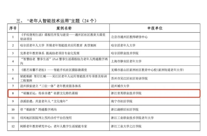 此前,智慧旅游分院创新实践项目“校社联动智慧家教 助力晚年幸福生活”入选教育部职业教育与成人教育司社区教育“能者为师”实践创新项目第二批启动名单,成为“生活技艺”主题的5个项目之一,项目负责人为黄华、陆佳怡。