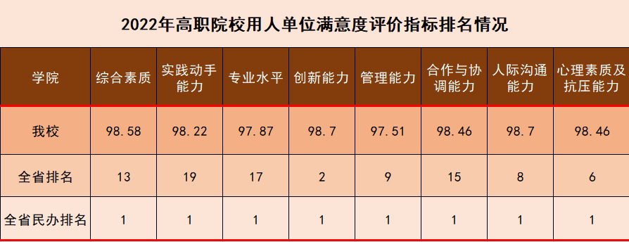 浙江省教育评估院《2021届浙江省高校毕业生职业发展状况及人才培养质量调查报告》发布,用人单位对毕业生满意度评价,我校八项指标位居全省民办高职院校首位;职业发展与人才培养质量在全省48所高职院校中位列21名。