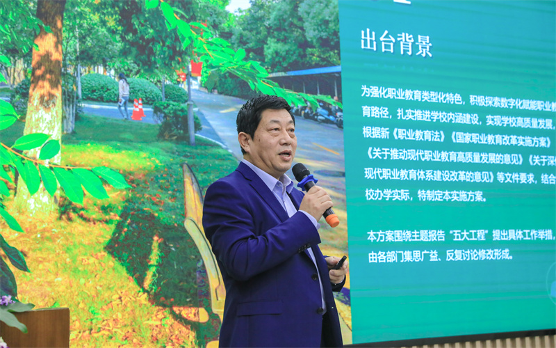 会议主题是强化职业教育类型特色、数字化升级教学改革,奋力推进学校内涵建设,实现学校高质量发展。