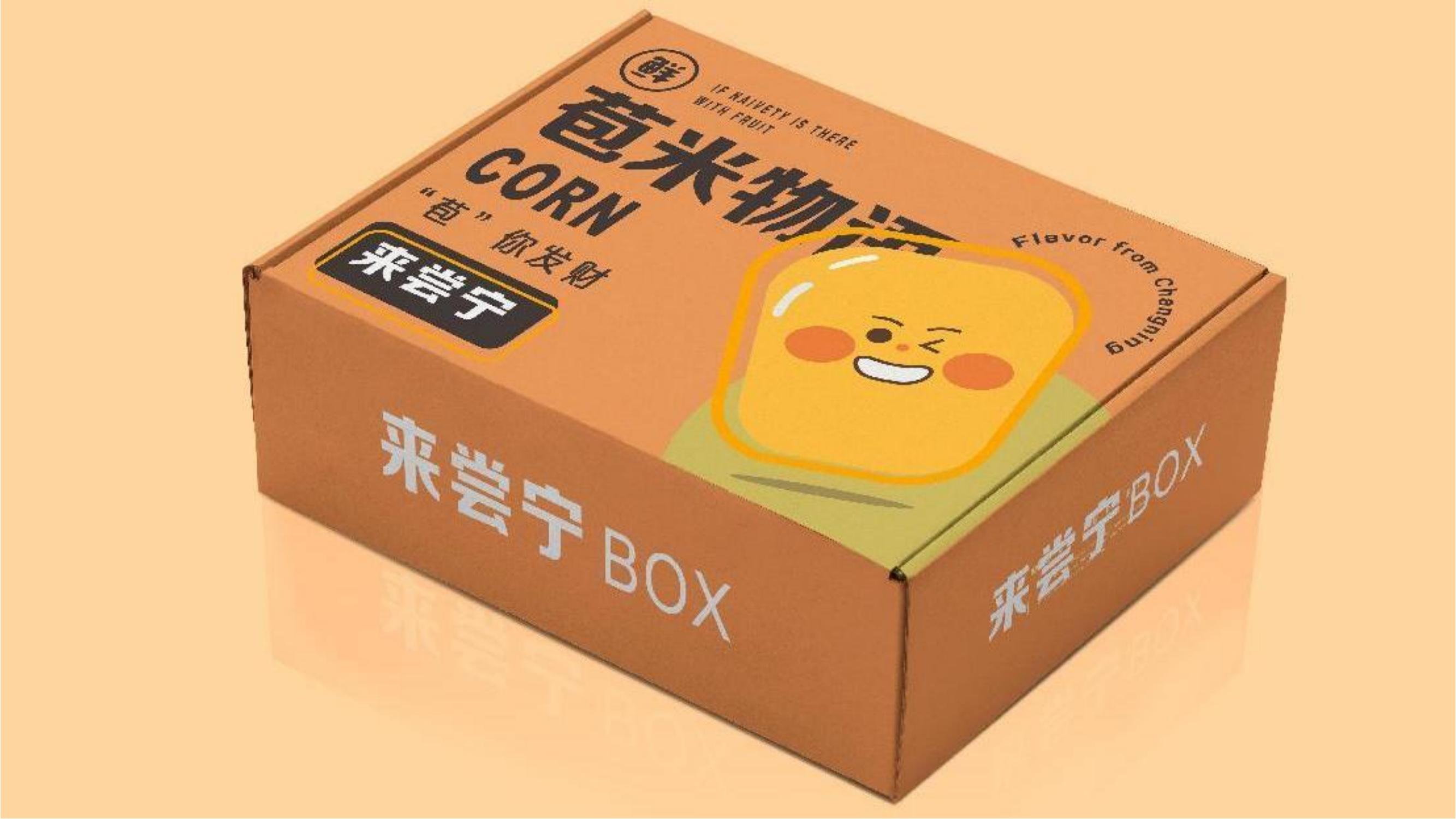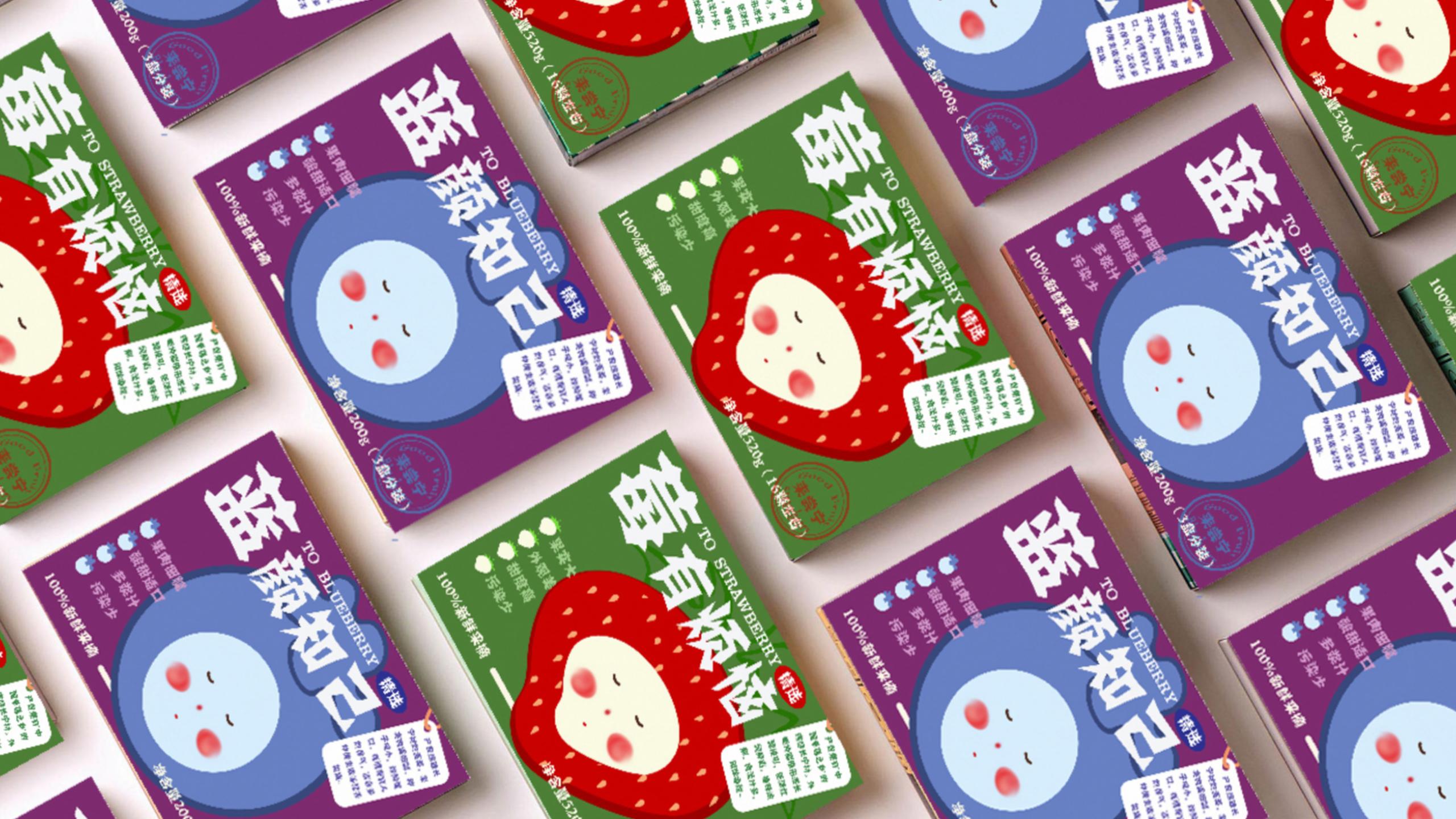 21广告B班王苏慧在此次课程中完成了长宁草莓、蓝莓、玉米等特色农产品的包装设计。作品主体以现代卡通的艺术表现风格,设计了三组可爱的水果宝贝,红红的脸蛋代表着村民们一颗炽热真诚的心,让消费者感受到村民的热情友好,让人通过包装联想到产品的新鲜。包装名称大胆突破传统,运用网络红语的谐音梗方式,更加时尚,便于线上推广销售。右下角盖了“来尝宁”的印章,指明了产地长宁村以及“来尝宁”的品牌特色。
