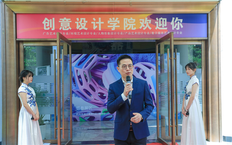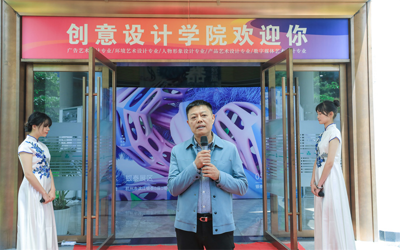 黄峥作为企业代表发言。他说,杭州矩创装饰工程有限公司和学校合作多年,有多名育英毕业生在矩创工作,现已成为公司主力设计师。今天除参加毕业设计展开幕式外,还安排了和创意设计学院的洽谈会,具体商议校企合作事宜。