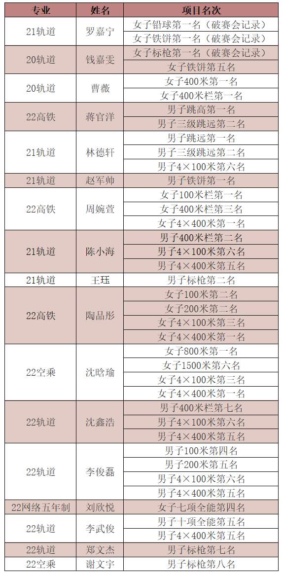 5月17-21日,由浙江省教育厅、浙江省体育局举办的浙江省第八届大学生田径锦标赛在浙江农林大学、浙江警察学院两校区进行。我校田径队经过4天的拼搏,以11金4银3铜破三项赛会纪录的成绩再次拿下了男女团体总分(乙组)第一名!这是我校田径队连续12次夺得省级及以上赛事团体总冠军,实属不易!21轨道专业陈小海、罗嘉宁和22安检专业王贻淳被评为优秀运动员,主教练汤剑辉老师被评为优秀教练员。