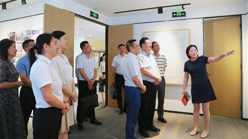 金承涛参观了校史馆和实训室,详细了解学校发展历程和发展成果,对学校以党建引领积极开展职业人才培养表示肯定,鼓励学校搭建电商直播实践平台,面向社会、面向市场,培养更多高素质技能人才,培育更多创新创业项目。