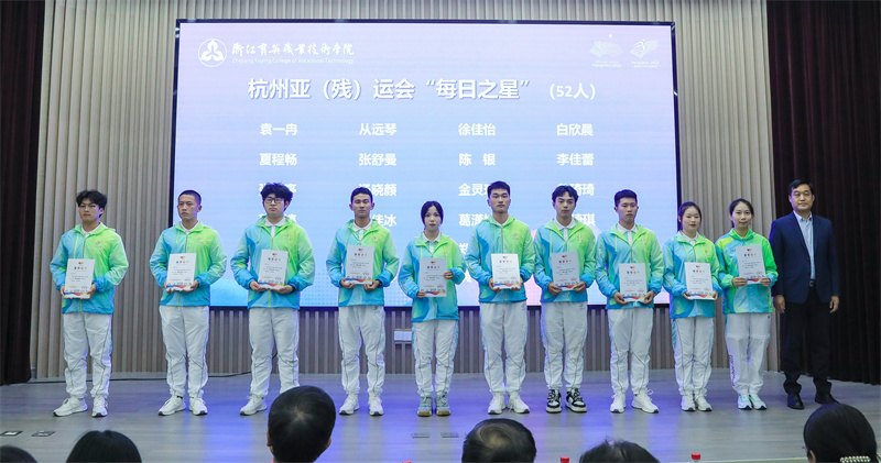 副校长徐晓斌为杭州亚(残)运会“优秀志愿者”颁发证书。