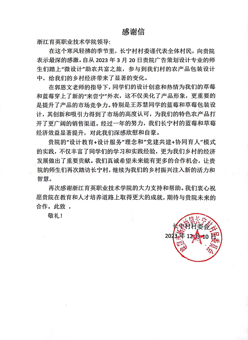 近日,建德市杨村桥镇长宁村村民委员会给学校发来了感谢信,对创意设计学院广告艺术设计专业师生“微设计”助农共富表示感谢。